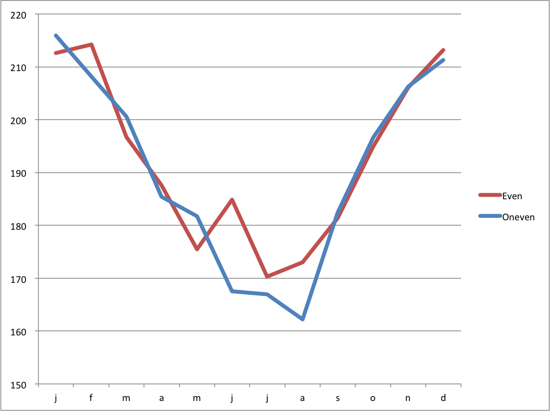 Als je gemiddelden van even en oneven op maandbasis tegen elkaar afzet krijg je het volgende beeld: