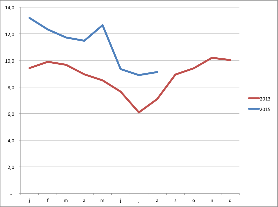 Gistermiddag ontving ik de maandelijkse rapportage van SKO, waarin een overzicht wordt gegeven van de kijkcijfers van afgelopen maand. Augustus in dit geval. De kijktijd is wederom teruggelopen. In augustus 2014 keken we gemiddeld 176 minuten naar televisie. Dit jaar was dat 160 minuten in dezelfde maand. Dat is 9% minder, maar dat is een op zichzelf staand cijfers. Het is natuurlijk beter om naar een wat langere periode te kijken. Daarvoor heb ik alle maandelijkse kijktijden vanaf 2008 tot nu in een Excelletje gezet en gekeken of er daadwerkelijk verschil zit in even en oneven jaren en hoe groot de daling in 2015 precies is ten opzichte van vorig jaar en vooral 2013. Want dat is een beter referentiejaar dan 2014, aangezien 2013 net als 2015 geen ‘sportjaar’ is. Voor 2013 en 2015 is ook onderscheid gemaakt naar lineair en UGK. Cijfers en grafieken na de break.