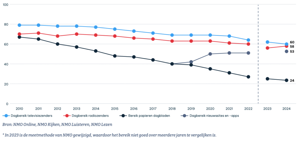 Verder ziet het Commissariaat dat jongeren in hoog tempo het televisienieuws verlaten – slechts een fractie van de 13- tot 19-jarigen kijkt nog lineaire nieuwsprogramma’s – terwijl online video via sociale media die plaats inneemt. Hier ontbreekt echter de redactionele selectie die TV-nieuws kenmerkt. De NOS is op die platforms nog steeds de zichtbare Nederlandse nieuwsspil (NOS Stories), maar de context is fundamenteel anders. Nieuws wordt een stroom van fragmenten, ingebed tussen entertainment, influencers en en gestuurd door algoritmes.